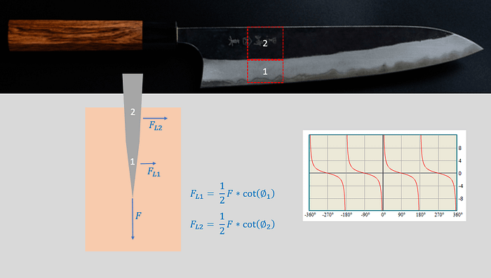 This is easy to prove by calculating lateral force of two flat-ground knives as wedges. Bear in mind that lateral force is what splits apart a product as the knife passes through it, so a low lateral force means lots of pushing and cracking. So let’s compare lateral force of 7 vs 15 degrees.