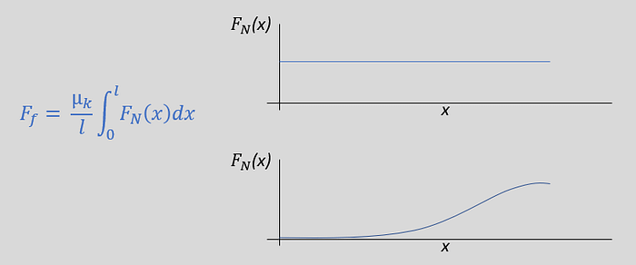 To understand what these graphs mean, it may be helpful to know that the integral sign in the equation to the left means we’re measuring the area under the curve. For a back-of-the-envelope calculation I did in Excel, the flat ground surface had friction four times higher than the convex surface (~2 vs. ~0.45 F_N).