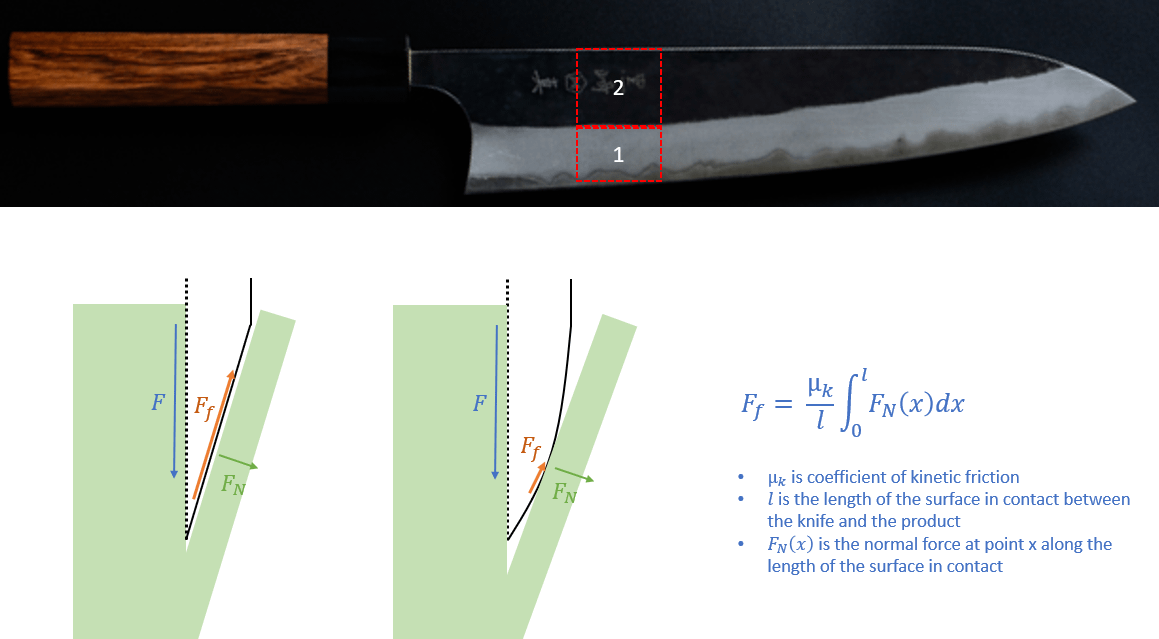 In reality, of course, things we cut with knives are bendy and so a convex knife won’t result in a single point of contact like the image shows. But surfaces with less contact will exert less normal force; thus, they contribute minimal friction while allowing more efficient portions of the knife to perform work on splitting the product.